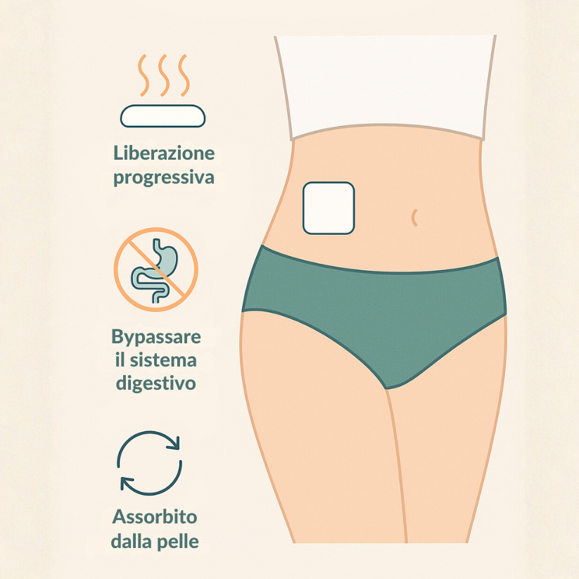 I nostri cerotti offrono un netto vantaggio rispetto alle compresse: rilasciano i principi attivi direttamente nel flusso sanguigno, aggirando il sistema digestivo, per risultati più rapidi ed efficaci.