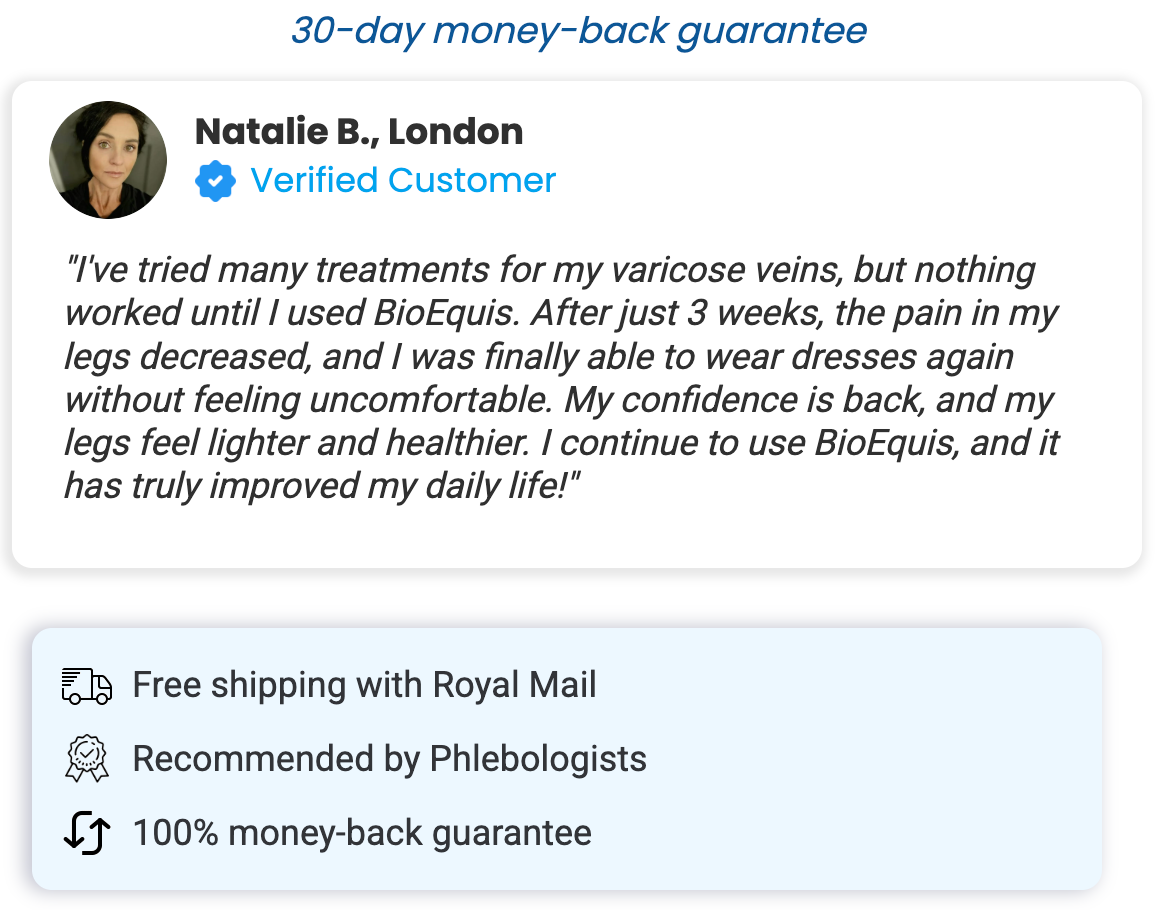 BioEquis is here to help. It strengthens and repairs your veins, reduces swelling, and promotes blood flow. With regular use, you can see smoother, pain-free legs in just four weeks. Ready to say goodbye to those uncomfortable varicose veins?